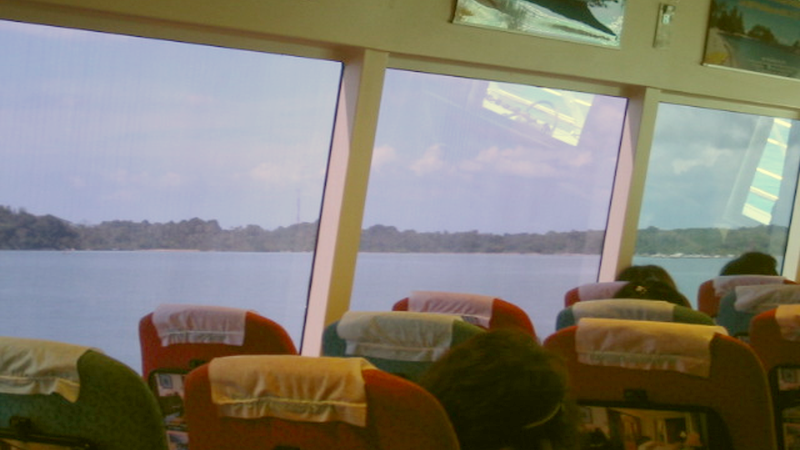 フェリー前部中央に座りましたが、結構揺れました。この調子だと、左右の窓際はもっと揺れそうな感じです。フェリー内には売店もあり、スナックやちょっとした食事なら、ここで摂ることもできます。でも揺れで気分悪くなりそうです。