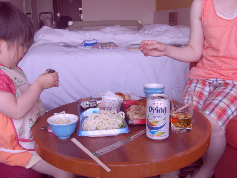 今回は、レンタカーで外出したついでにコンビニで食事を調達して、部屋で頂きました。朝食ブッフェは混み合うため、ちょろちょろとうろつく乳幼児は入りにくい。。。時間を気にせずにすむ部屋ご飯はお気楽です。