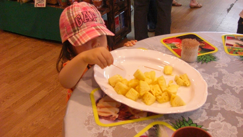 帰り道に、名護パイナップルパークに立ち寄りました。パイナップルキャラクターがお出迎えしてくれます。電動カートでパイナップル畑を回り、最後はパイナップル食べ放題に舌鼓を打ちます。
